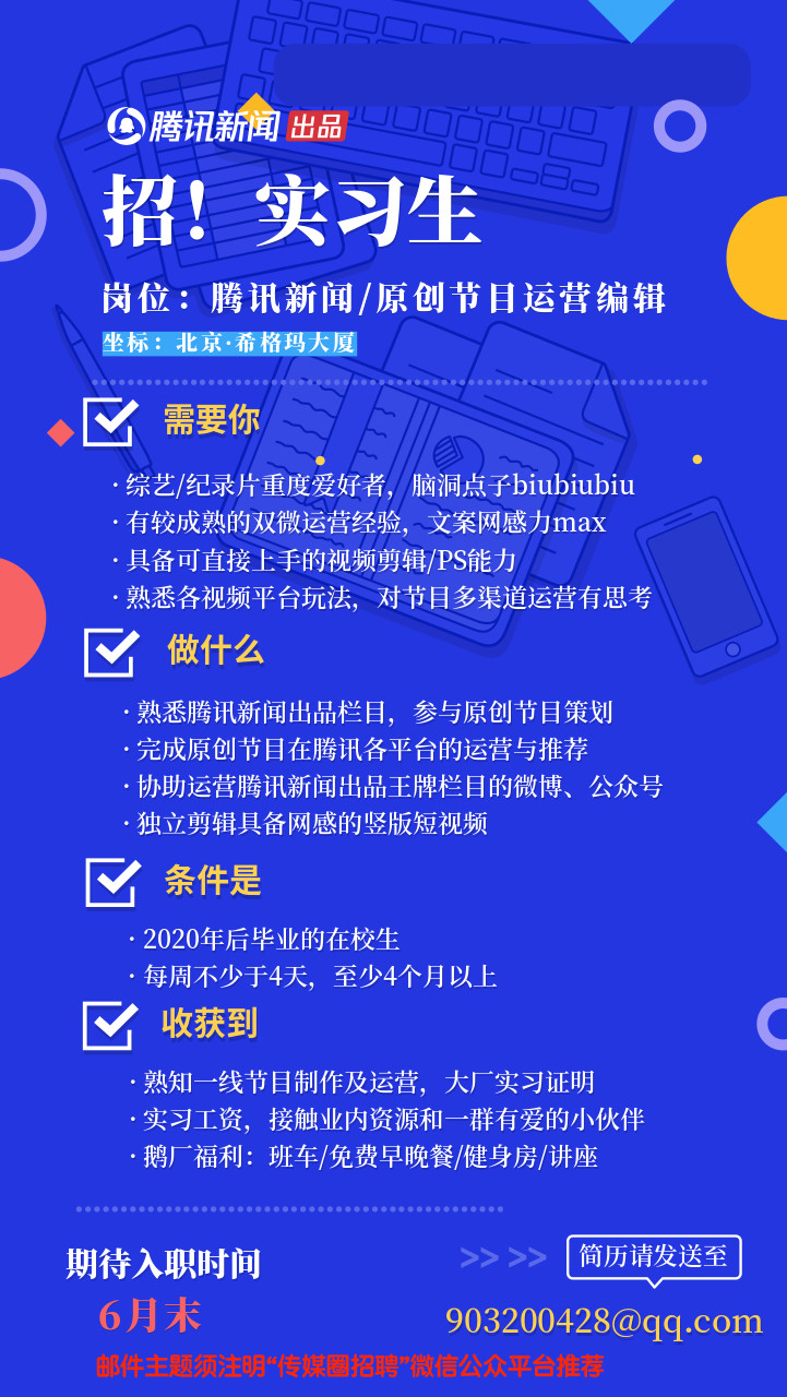 【实习】腾讯新闻招募原创节目运营编辑实习生!
