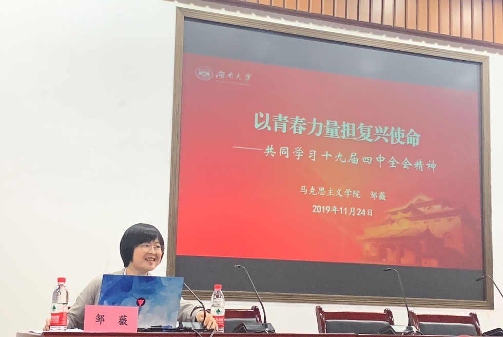 接着,邹老师用三个“十分”概述了十九届四中全会的历史意义:主题十分重大,时机十分关键,部署十分重要。邹老师着重讲述了当前中国面临的“百年未有之大变局”究竟是如何体现的。