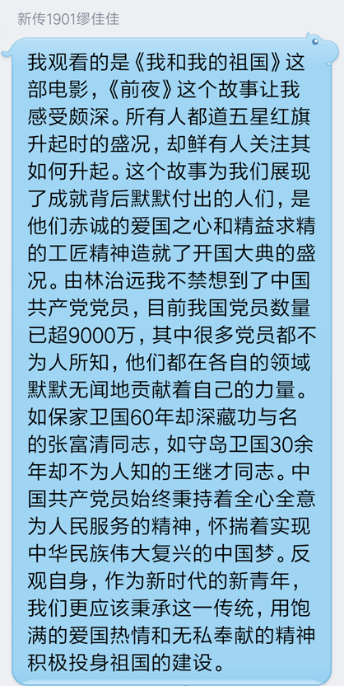 新影院入党积极分子培训班第六小组于2019年12月18日晚19:00在线上展开了主题为“不忘跟党初心,牢记青春使命”的研讨活动。本次研讨活动,第六小组全员到齐,在线上就红色革命电影和中国改革开放主题电影展开了热烈的讨论与交流。