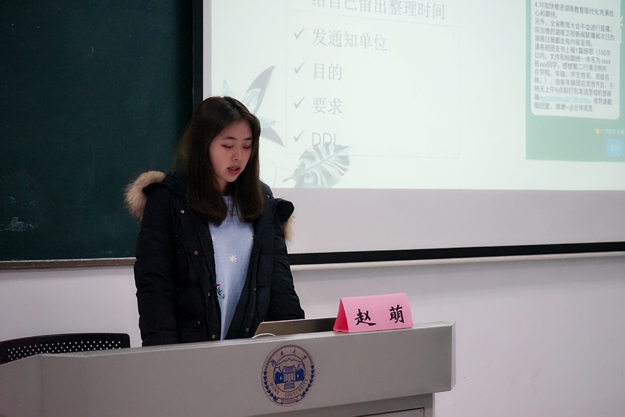 新影院学生会主席蔡淑鑫,首先就如何做好一名班级干部的话题开始了讲话,她鼓励大家主动调动班级积极性,完善如班费收支情况等班级制度。接着,蔡淑鑫与18级干事们分享了众多如何做好学生工作的干货,如要注意礼貌;多听多干活,动脑子办事;对布置的任务有积极的反应和注意调整自己的人际关系等。同时,她引用了自己在大一工作的经历,让在座的学生干部们了解如何处理好自己身兼的多个职位,并提醒同学们不要因为懒散娱乐而舍弃掉自己的工作时间。
