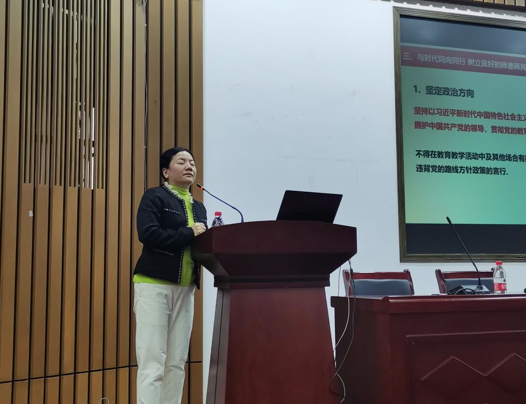 胡建国首先传达了教育部师德师风建设视频会议精神,要求教师贯彻落实教育部及学校要求,对标对表,精准发力,健全制度机制、强化责任落实,切实把教师思想政治和师德师风建设的各项工作抓实抓稳,全面压紧责任链条,持续深入抓好“十项准则”,确保教师队伍风清气正。