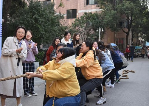 随着裁判员“预备”口令地发出,双方队员拿起了绳子,并拉直做好准备,一声哨响,激动人心的拔河比赛正式开始。场上队员“一二”“一二”整齐的口令声,以及场下队员和观众用力的加油声使得比赛气氛更加热烈,所有人的眼睛度盯紧了绳子上的标志以及地上的河界。随着主裁判吹哨,并且做出判定手势,新影院取得了本场比赛的胜利,第一轮比赛宣告结束。