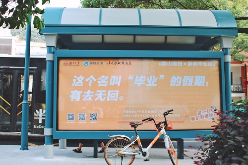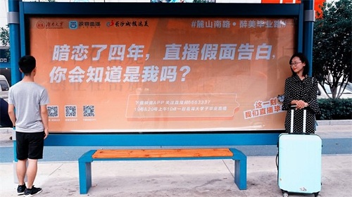 新闻传播与影视艺术学院敢为先文创团队策划,联手映客直播、长沙城投达美共同推进的毕业活动。除了毕业主题的公交站牌送祝福外,6月19日至6月20日还将在校内荫马塘运动场开展毕业直播亭活动。