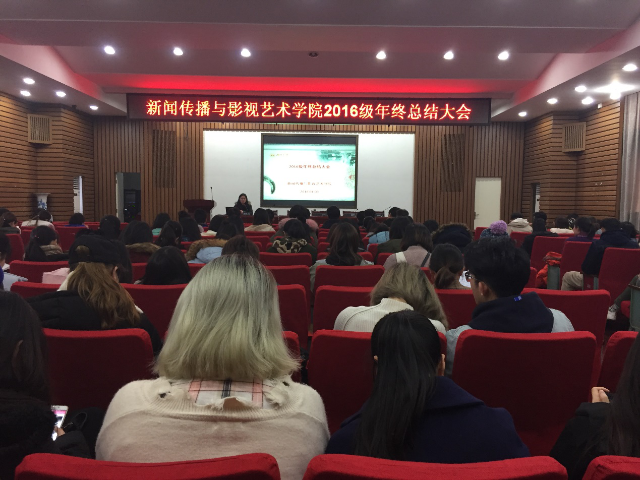 教学北楼217报告厅召开年终总结大会。本次大会由新影院学工办主任、16级辅导员刘婵老师主持。