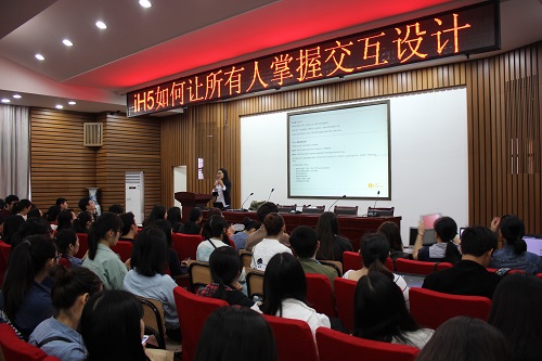 讲座中,郁佳凤向参与者展示了一些流行的H5页面,如“我和宋仲基结婚照”“BMW M2预售”等,并让大家扫描二维码观看。郁佳凤认为,大家看到的比较多的交互方式是人机交互、机机交互和网页元素间的交互。她指出,通过IH5.cn可以实现这些H5页面的制作。另外,还展示了一些由iH5.cn制作出的H5案例,如“上海迪士尼花费计算器”“听听总理这些话”等。她表示,这一编辑器有着强大的功能。在现场教学阶段,她为大家介绍了编辑器的入门功能,包括动效动画、计数器等,部分参与者现场利用手中的电脑进行了操作。
