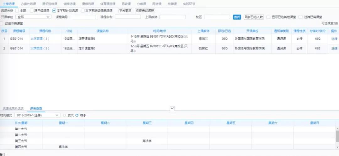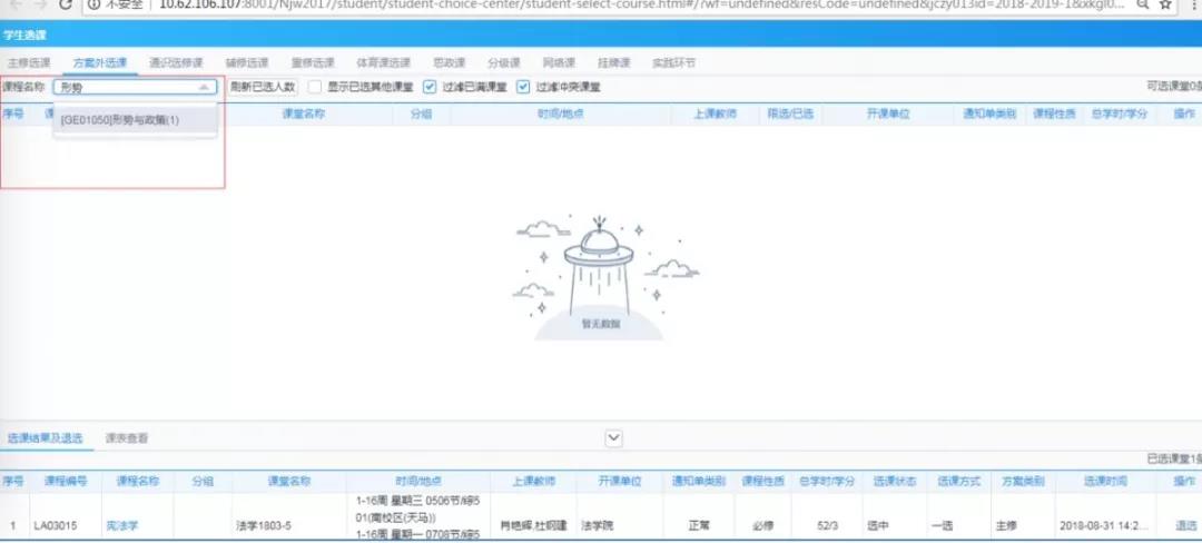 注意事项:方案外课程由于数据量较大,默认不加载待选课程。需要通过课程名称查询出该课程的可选课堂。
