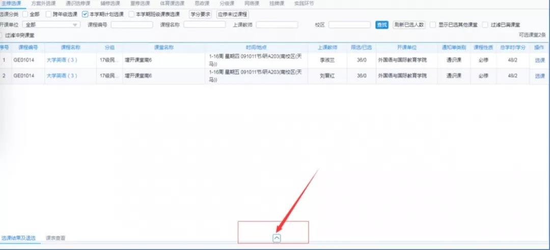 如下图4.3所示,左键单击底部展开按钮,配合操作区4位置“选课结果及退课”、 “课表查看”可以查看已选课程,如图4.4、图4.5所示。