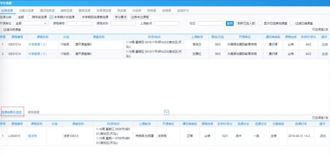 (一)必修课程在开放选课前已经由系统预置进个人课表,本专业的培养方案是按照课程的前后衔接顺序安排的,既考虑前导课程与后续课程的相互关系,选课时要认真审核自己选定课程的课程号,确保其属于本专业教学计划规定的课程。请学生在选择退课时谨慎考虑,退课后存在其它课程容量已满而无法选上的风险,建议不要自行操作退选,因个人因素自行更改培养方案退选课程,导致延迟毕业或不能毕业的,由学生自行负责(初修的实践教学必修课程学生名单也会预置进教务系统,因学籍异动需增加或取消、成绩不合格需重修实践教学课程的,学生个人在选课阶段通过教务系统进行选课);后续复学导致未预置必修课程的,应在复学后及时到本学院教务办办理有关事宜。